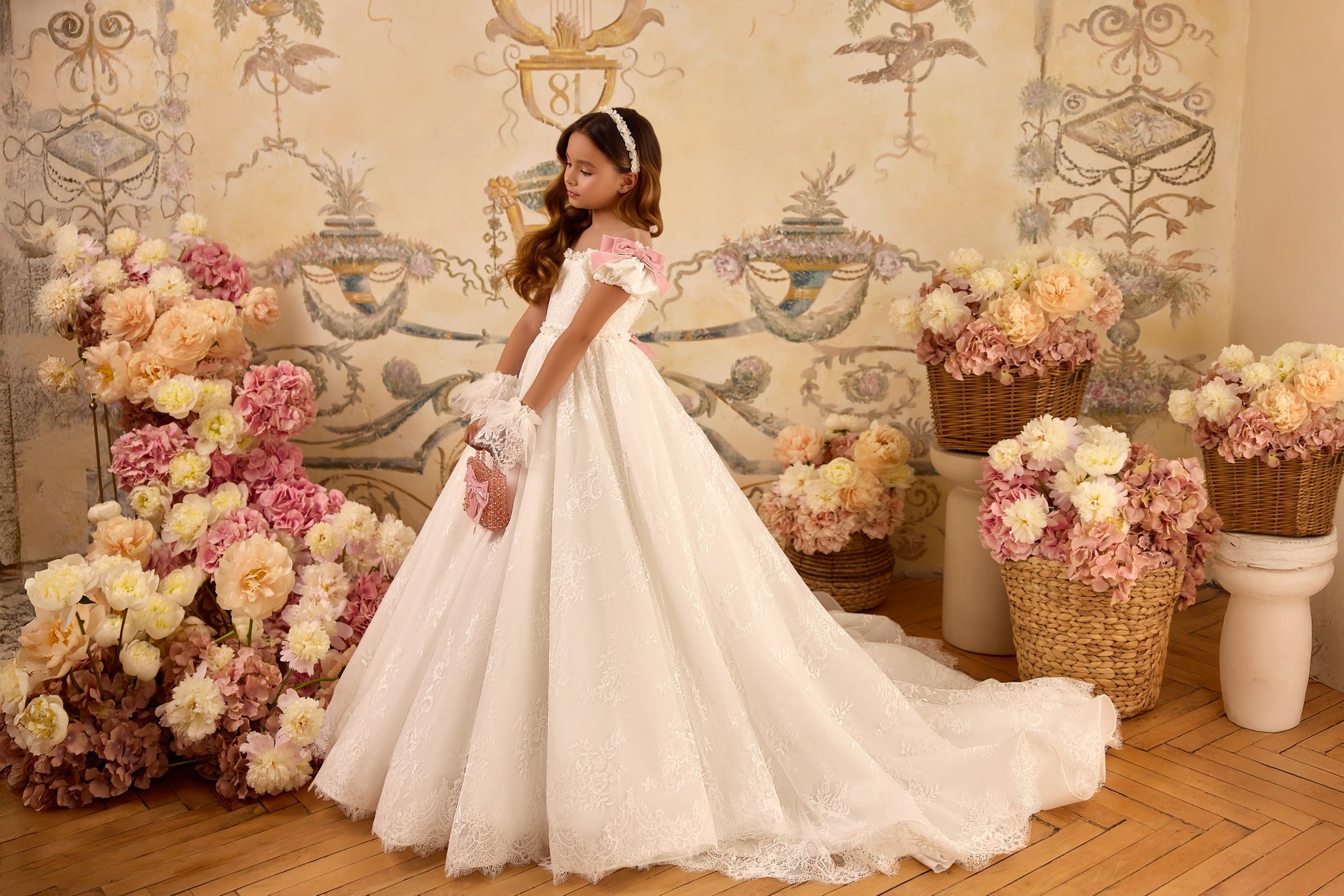 This elegant flower girl dress features delicate French lace and soft pink bows, creating a timeless vintage look. The flowing train adds a graceful touch, perfect for formal occasions and weddings. Designed for comfort and style, it ensures your little one looks charming while feeling at ease throughout the event. Ideal for creating memorable moments with a classic, refined aesthetic.